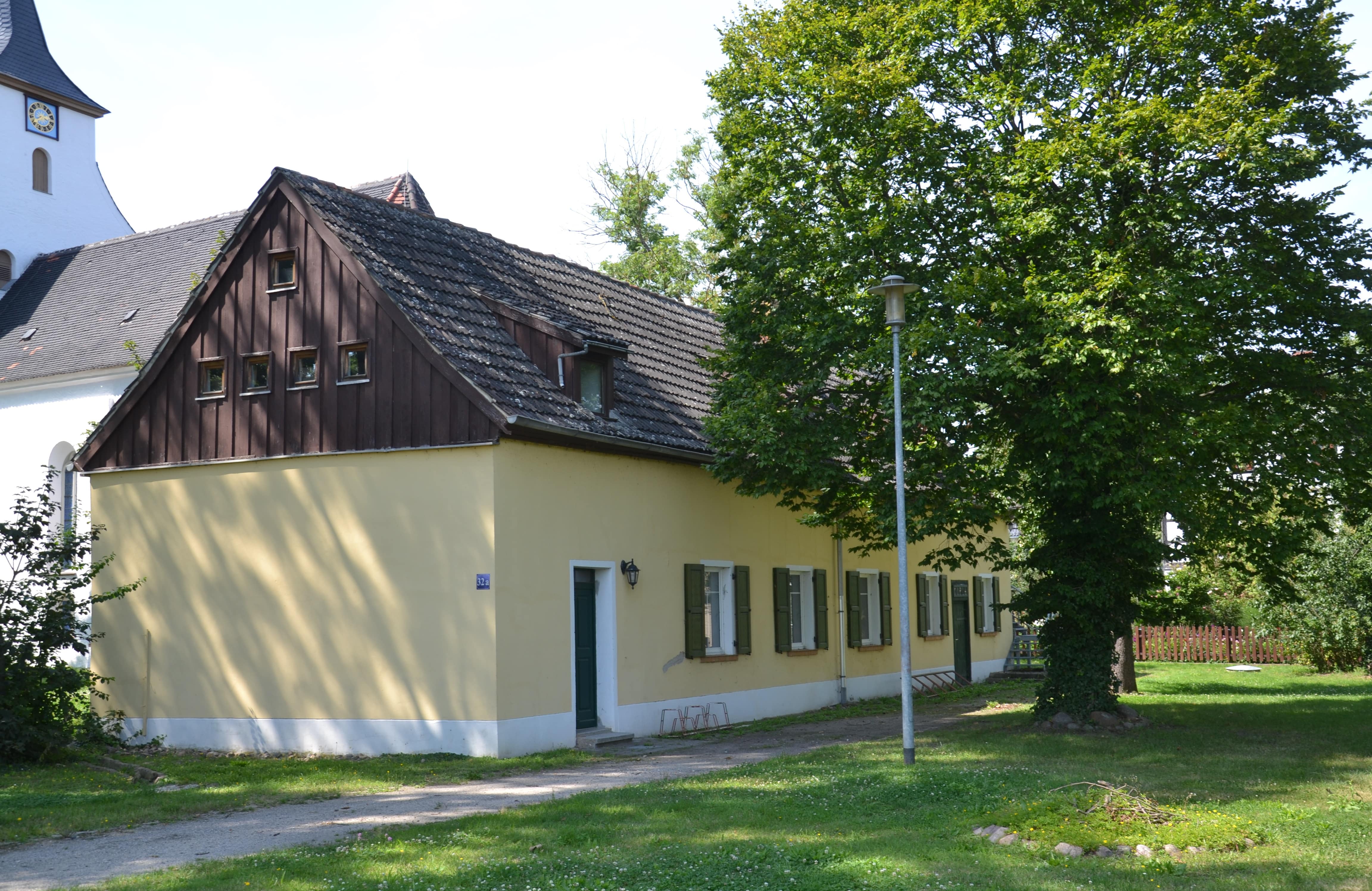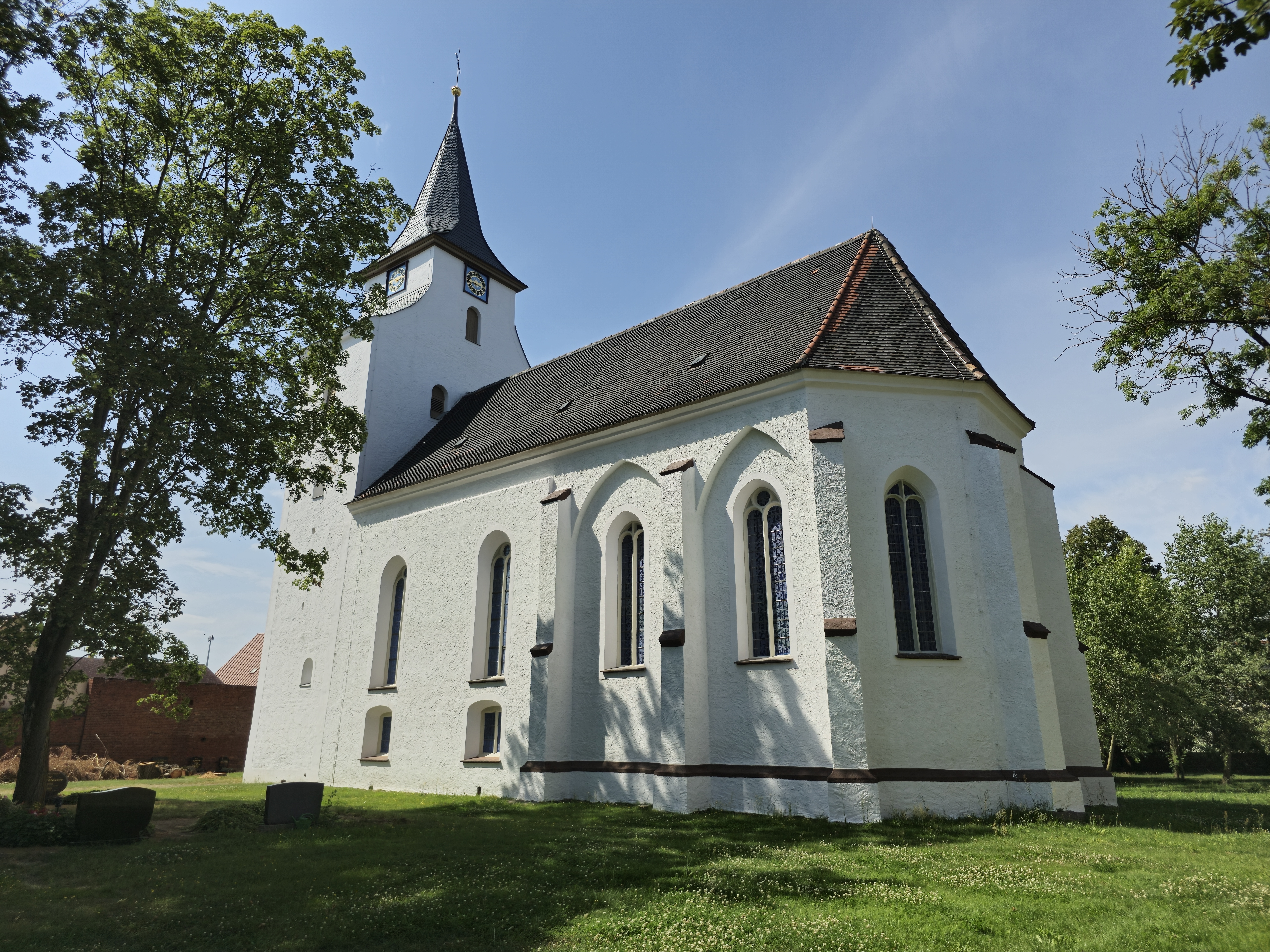 Die Kirche ist in Teilen romanischen Ursprungs. Die unteren Teile des Kirchenschiffes und des Turmes sind wohl um 1200 errichtet, weitere Bauteile sind der Gotik zuzuordnen. So zeigen die Inschriftsteine an der Ostwand des Chores u.a. die Jahreszahl 1418. Der Chor und die Sakristei sind mit einem Netzgewölbe überdeckt. Die Kirche wurde in den Jahrhunderten mehrfach renoviert und umgebaut, zuletzt 1968 (?). Von einem "bemerkenswerten spätgotischen Triptychon", der an einigen Stellen (u.a. auf der Webseite der Gemeinde Schönwölkau) erwähnt wird, weiß ich leider nichts, (werde aber mal danach forschen :). Die Kirche hatte ursprünglich 3 Glocken, deren älteste vom Beginn des 14. Jh. stammt, die beiden anderen von 1664 und 1782. Leider wurden während des 2.(?) Weltkrieges 2 davon eingeschmolzen. Das Pfarrhaus stammt aus dem Jahr 1786 und wurde Anfang der 90er Jahre saniert.